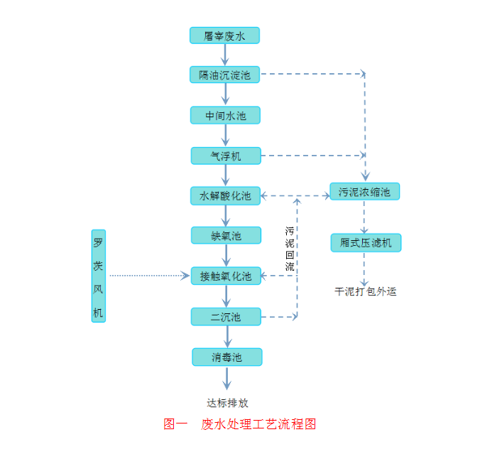 屠宰廢水中含有定量的碎皮、碎肉、牛毛、糞便、殘余飼料等懸浮物,較高的色度,為了提高污染物去除效率,均先采取格柵或篩網(wǎng)去除廢水中較大粒徑的懸浮物,后加藥混凝反應(yīng)后再進行沉淀或氣浮處理?;炷窍蛩型都铀巹ㄟ^快速混合,使藥劑均勻分散在水中,然后反應(yīng)形成大的可沉絮體?;炷a(chǎn)生的較大的絮體通過后續(xù)沉淀或氣浮的固液分離手段從水中分離出來。沉淀分離的特點是投資小、占地面積大、處理時間長、污泥含水率高、運行管理簡單、故障率低等;氣浮分離的主要特點是分離速度快、污泥含水率低、占地面積小、運行管理復(fù)雜、運行費用高等。